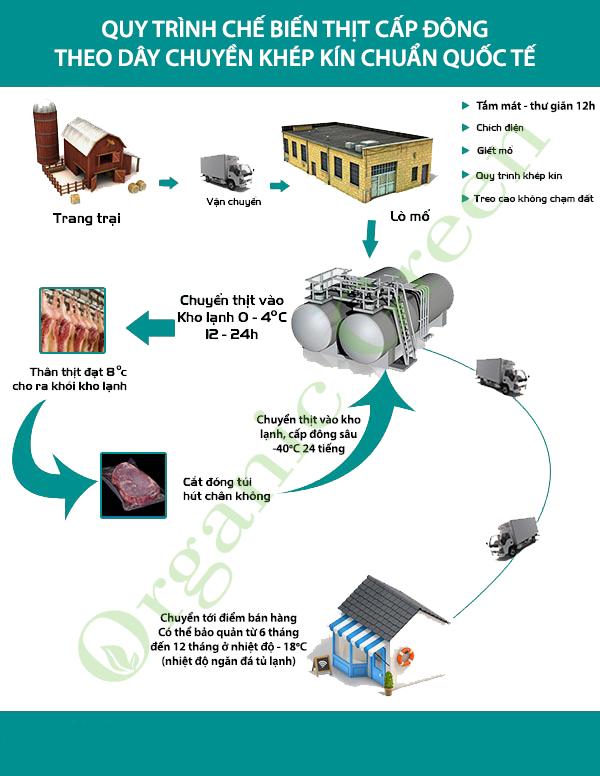 Sau khi mổ sẽ được đưa qua khu đóng gói và hút chân không, quá trình diễn ra không quá 30 phút. Sau đó thực sẽ được cấp đông ( làm dông lạnh cấp tốc ở khoảng -20 độ C). Nhiệt độ này được USDA Mỹ khẳng định là an toàn với sức khỏe chúng ta.